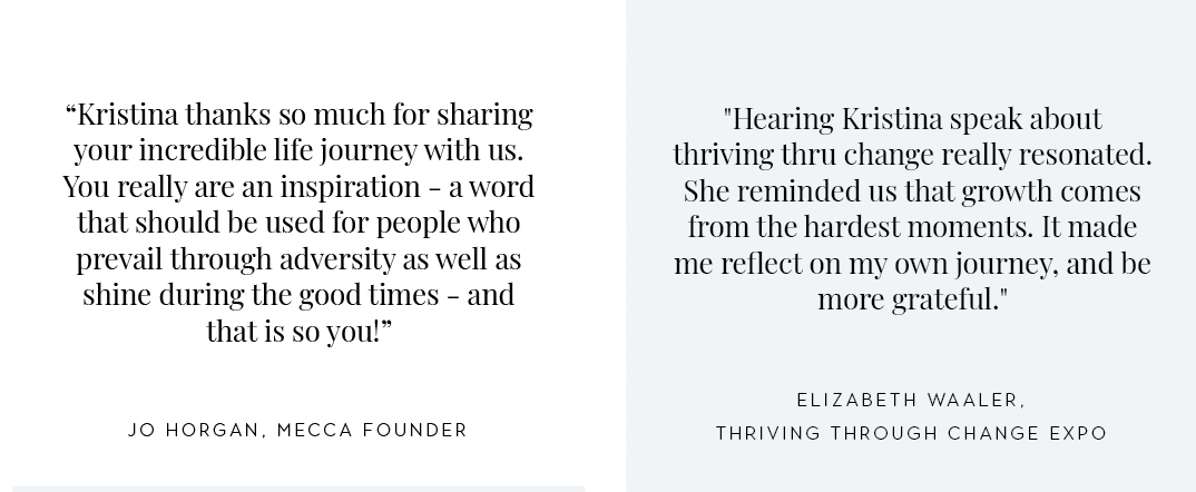 âKristinaâs keynote was exceptionally raw, genuine and deeply impactful. She not only shared her story with honesty and generosity, but took the time to stay and speak with participants afterwards - an experience many described as a career highlight that reshaped how they think about their businesses and their futures.â