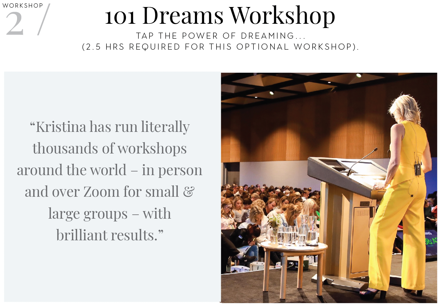 - As a valuable add-on, Kristina can facilitate her powerful and now famous 101 Dreams Workshop for you after the keynote, so people leave with dreams written on paper. Excited and ready to action. Personal, team, business, or all the above.