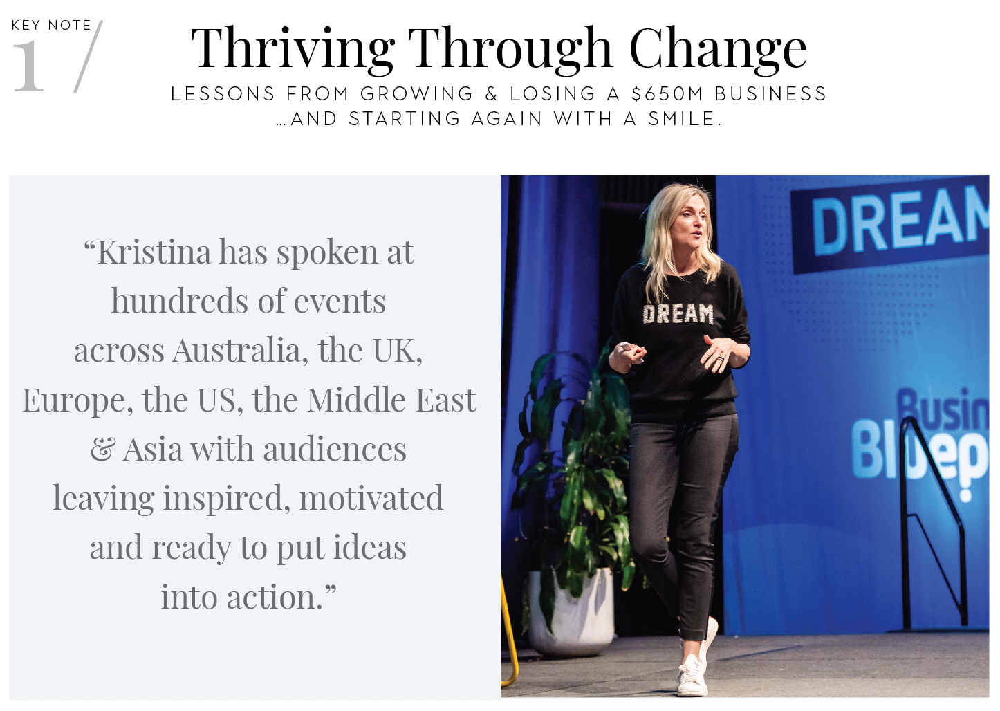 History is peppered with the real-life stories of people who have broken the mould â dreamed up a new future â and gone on to make those dreams reality. Kristina is one of them, and in this engaging and raw presentation, she shares the key business & personal lessons she learned along the way - from business success to failure â and starting again, with a smile.